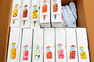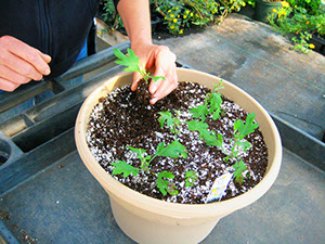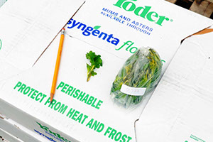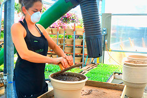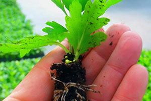 The Garden Mum season begins in May. Un-rooted cuttings arrive and are "stuck" in plug trays for the rooting process. Approximately 4 weeks later, roots have developed and the potting begins mid June.