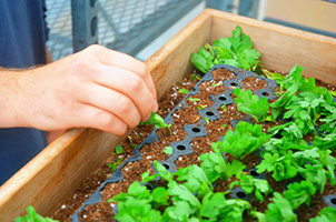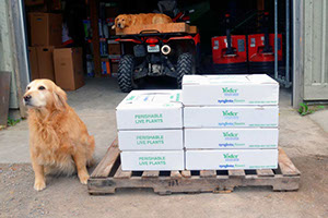The Garden Mum season begins in May. Un-rooted cuttings arrive and are "stuck" in plug trays for the rooting process. Approximately 4 weeks later, roots have developed and the potting begins mid June.